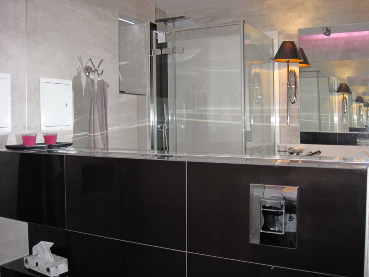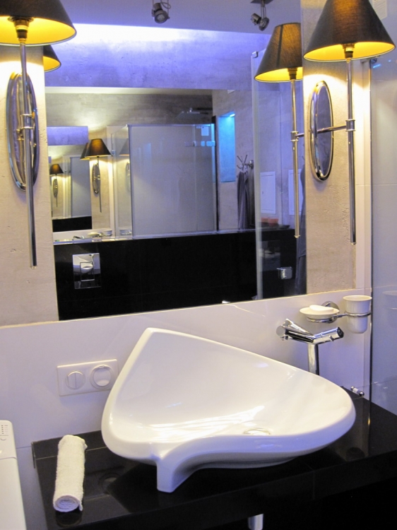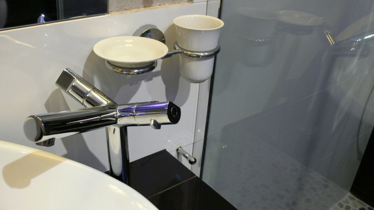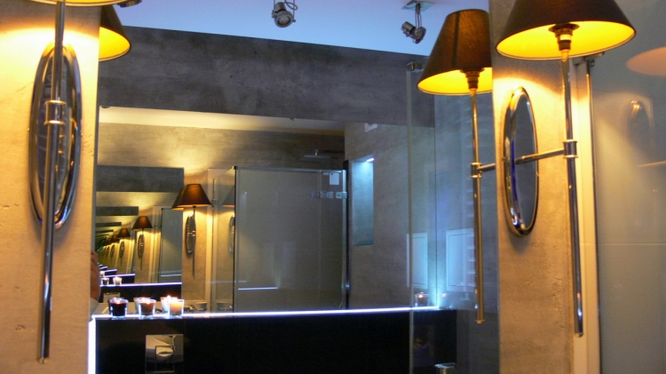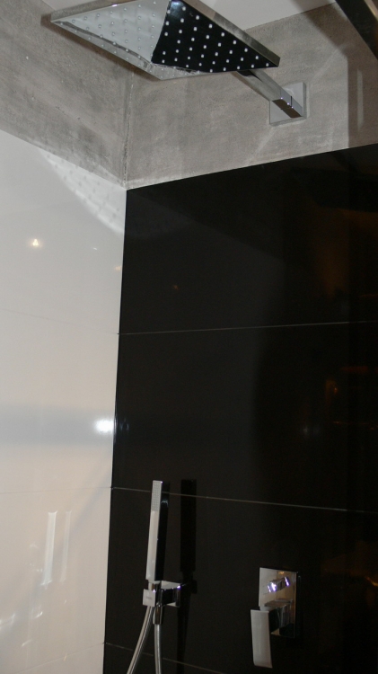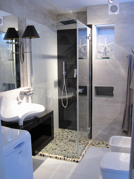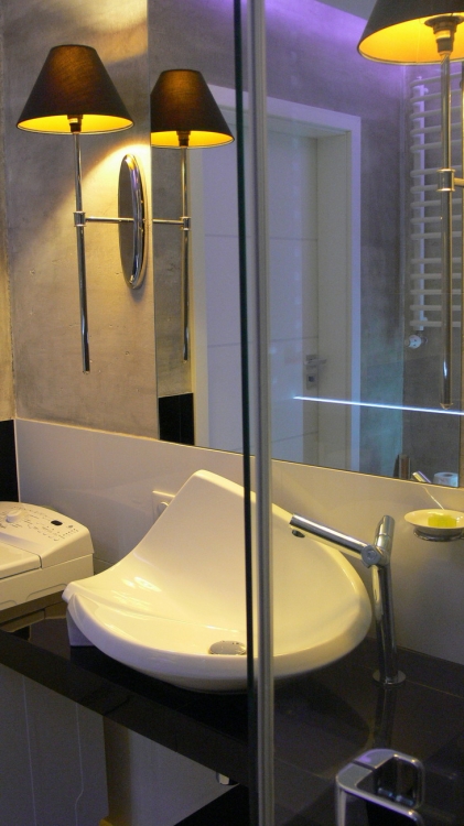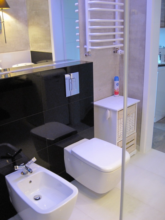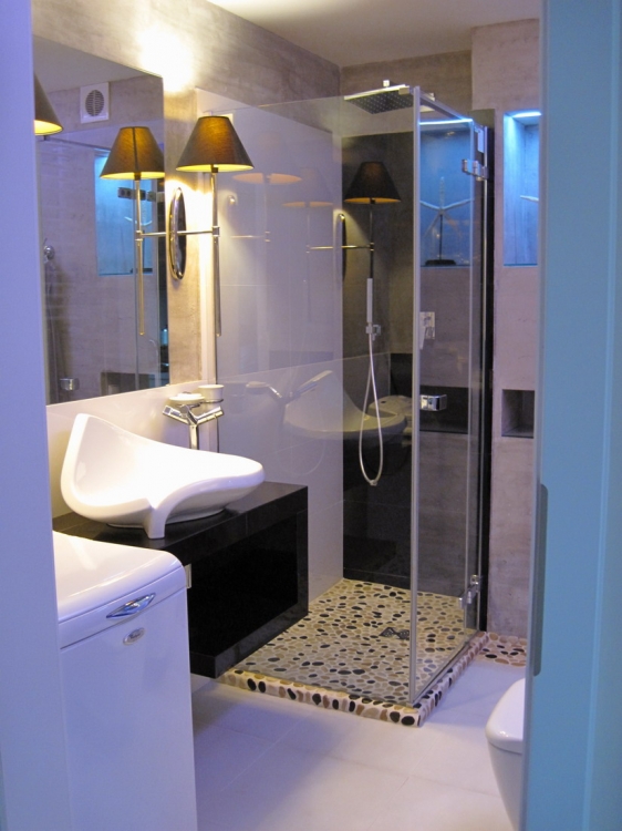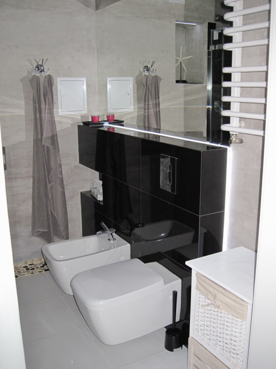 Łazienka o pow. 5,8 mkw.; przestronna kabina prysznicowa (80 x 110 cm), deszczownica Tres, wc i bidet Ideal Standard, umywalna Valdama seria Lied, baterie: Kludi New Waves, brodzik z naturalnych otoczaków, cztery rodzaje oświetlenia: led wąż, punktowe, fiolet, kinkiety Almi Decor. Pralka Whirlpool.