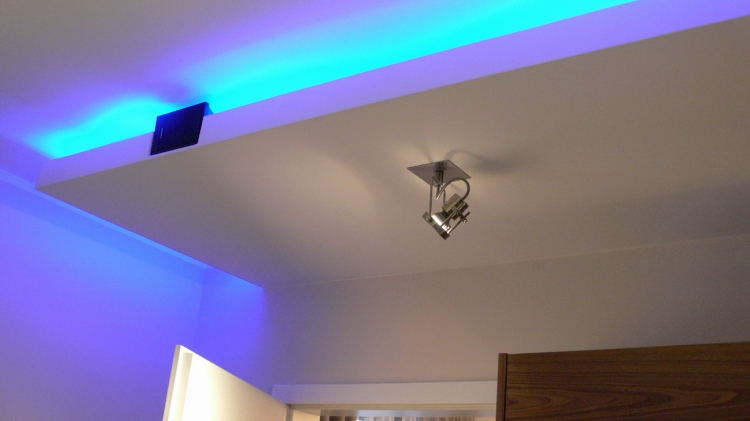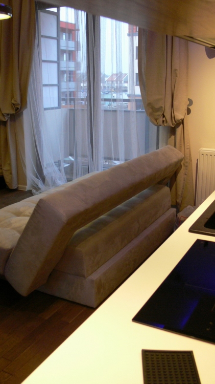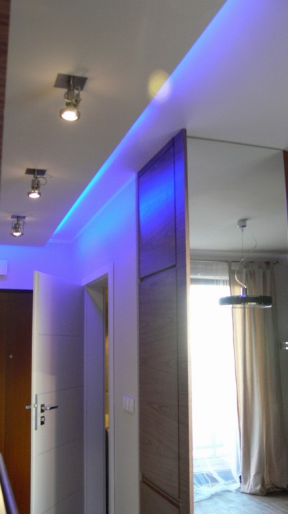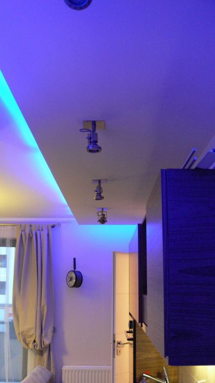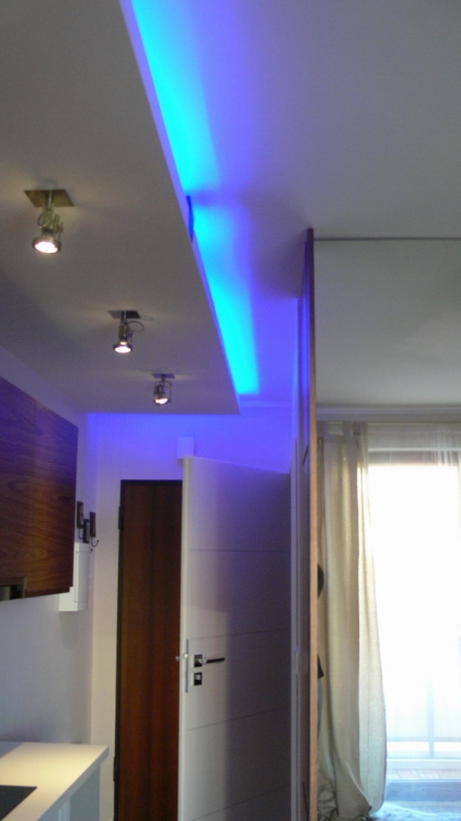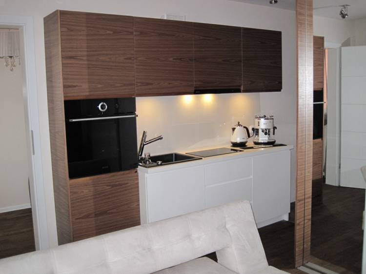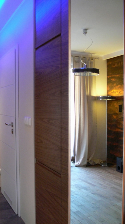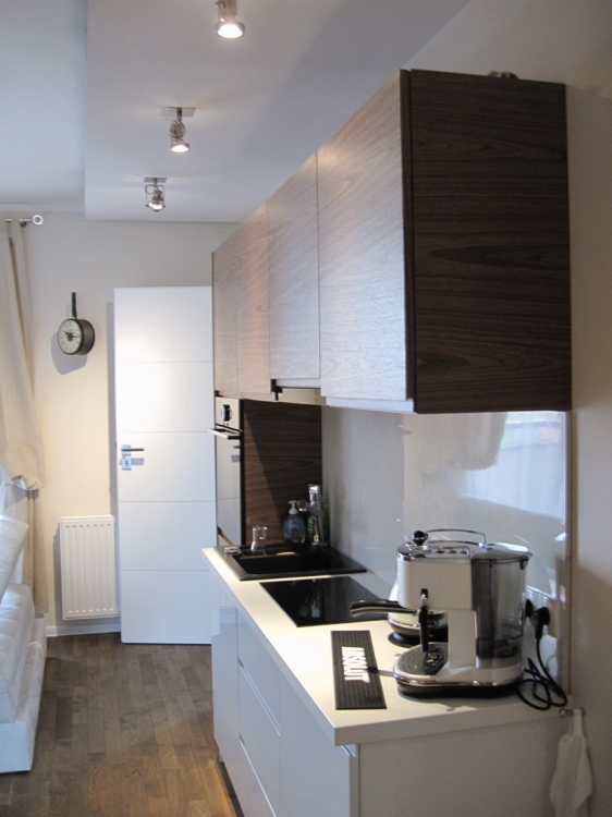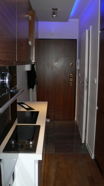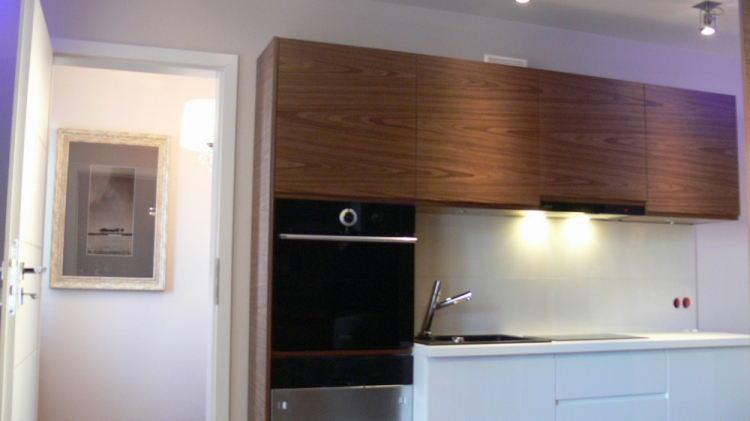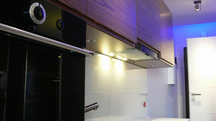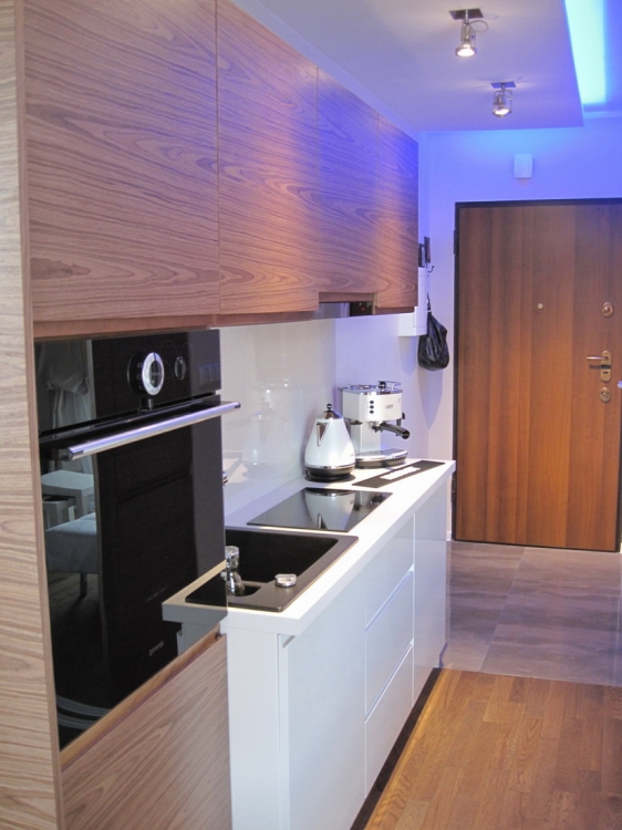Kuchnia: meble kuchenne fornir naturalny orzech i biały lakier. Sprzęt AGD: płyta, okap i piekarnik Gorenje, lodówka Liebherr, zmywarka Mastercook, zlew czarny kamień Alveus, bateria Kludi New Waves. W kuchni oświetlenie led, punktowe, oraz wąż ledowy w kolorze niebieskim.