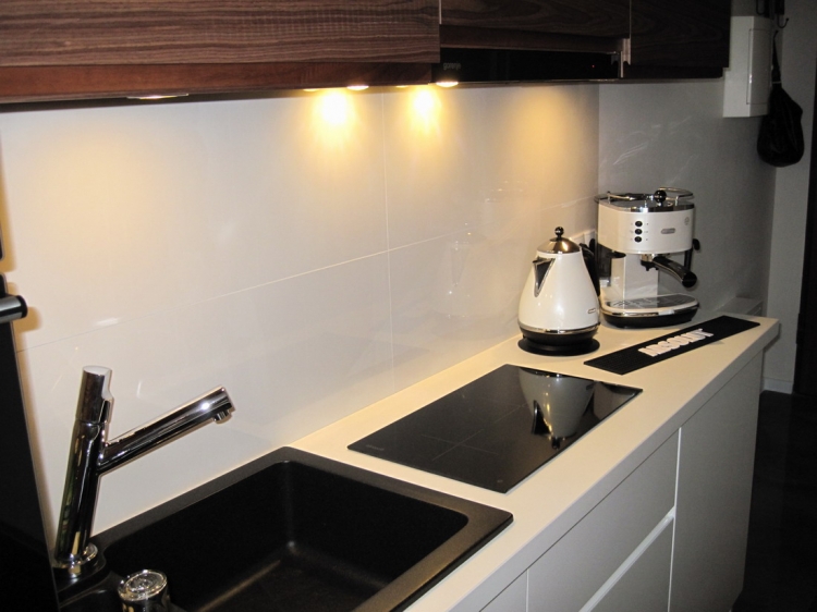 Kuchnia: meble kuchenne fornir naturalny orzech i biały lakier. Sprzęt AGD: płyta, okap i piekarnik Gorenje, lodówka Liebherr, zmywarka Mastercook, zlew czarny kamień Alveus, bateria Kludi New Waves. W kuchni oświetlenie led, punktowe, oraz wąż ledowy w kolorze niebieskim.