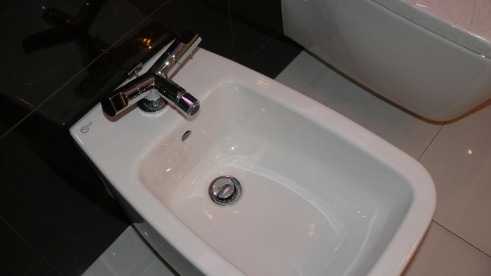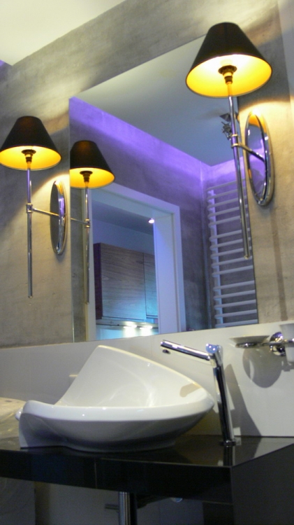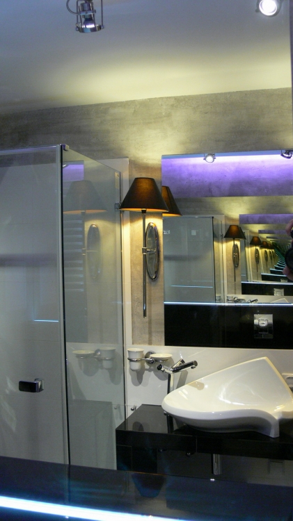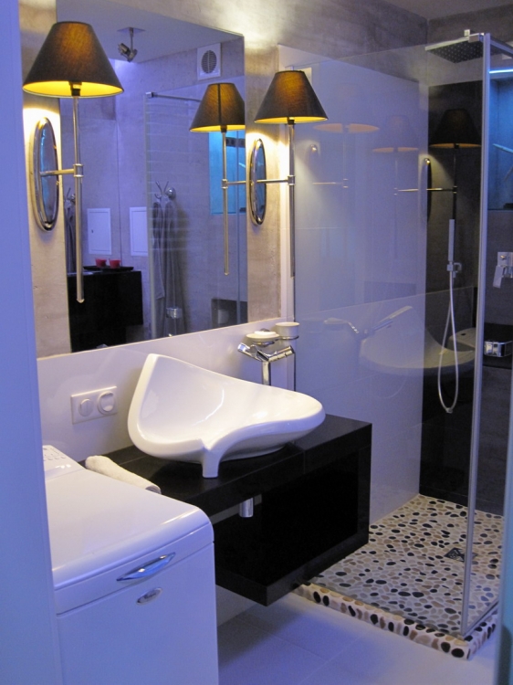 Łazienka o pow. 5,8 mkw.; przestronna kabina prysznicowa (80 x 110 cm), deszczownica Tres, wc i bidet Ideal Standard, umywalna Valdama seria Lied, baterie: Kludi New Waves, brodzik z naturalnych otoczaków, cztery rodzaje oświetlenia: led wąż, punktowe, fiolet, kinkiety Almi Decor. Pralka Whirlpool.